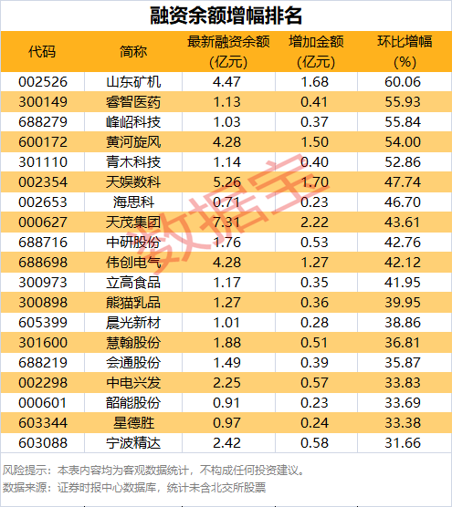 按融资余额环比变动来看,不含北交所股票,12月10日有19只股票的融资余额环比增幅超过30%。其中,山东矿机的融资余额环比增幅高达60.06%,位居首位。此外,睿智医药、峰岹科技、黄河旋风、青木科技等股票的融资余额环比增幅也均超过50%。