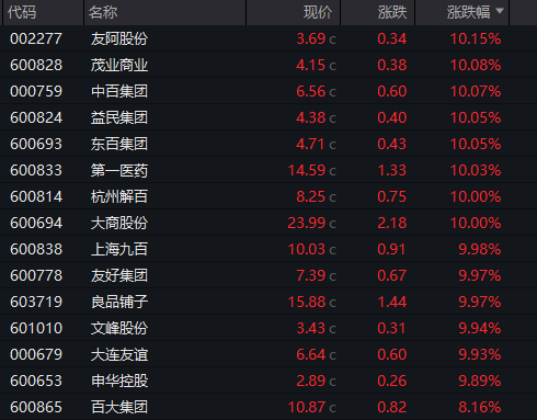 零售板块同样表现不俗,友阿股份、华联股份、茂业商业、杭州解百、上海九百等多股涨停,中百集团斩获三连板。