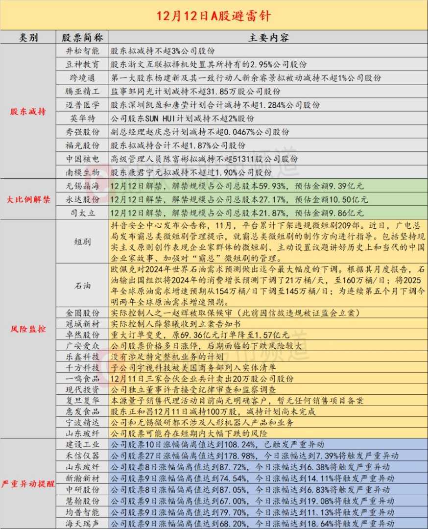 导读:财联社12月12日发布投资避雷针报告,概述A股及海外市场潜在风险事件。国内经济信息涉及网信办整治非法荐股活动、抖音下架违规微短剧;公司预警聚焦金圆股份实控人被取保候审、卓然股份订单大幅缩减等;海外市场重点关注美股收盘情况及欧佩克下调石油需求预测。