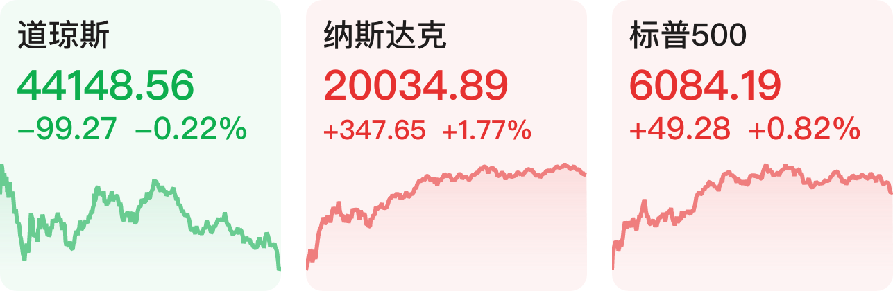 美股三大指数收盘涨跌不一。道琼斯指数微跌,纳斯达克指数大涨1.77%,首次站上20000点大关,标普500指数也有所上涨。通胀数据利好,美联储或再降息,提振股市。大型科技股普遍上涨,中概股则多数下跌。