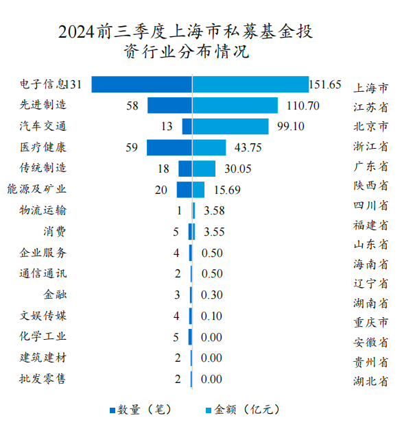 报告还显示,上海私募股权投资基金的投资主要集中在电子信息、医疗健康和先进制造行业,投资区域则主要集中在上海、江苏、北京、浙江、广东等地。浦东新区以177笔投资和197.85亿元的投资金额,在这些区域中脱颖而出。此外,全国区域的私募股权基金也热衷于投资上海的汽车交通、先进制造、电子信息、医疗健康领域。