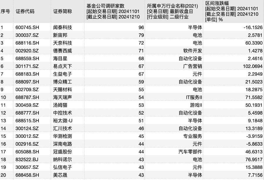 消费电子领域的闻泰科技、精细化工板块的新宙邦与天奈科技、智能驾驶产业链的德赛西威、激光及自动化领域的海目星,分别吸引了96家、79家、72家、71家、68家基金公司的调研,成为最受关注的五家上市公司。此外,生益电子、深南电路等电子元件及设备个股,博众精工等工业机械个股,以及天赐材料等精细化工个股也获得了较多基金公司的关注。