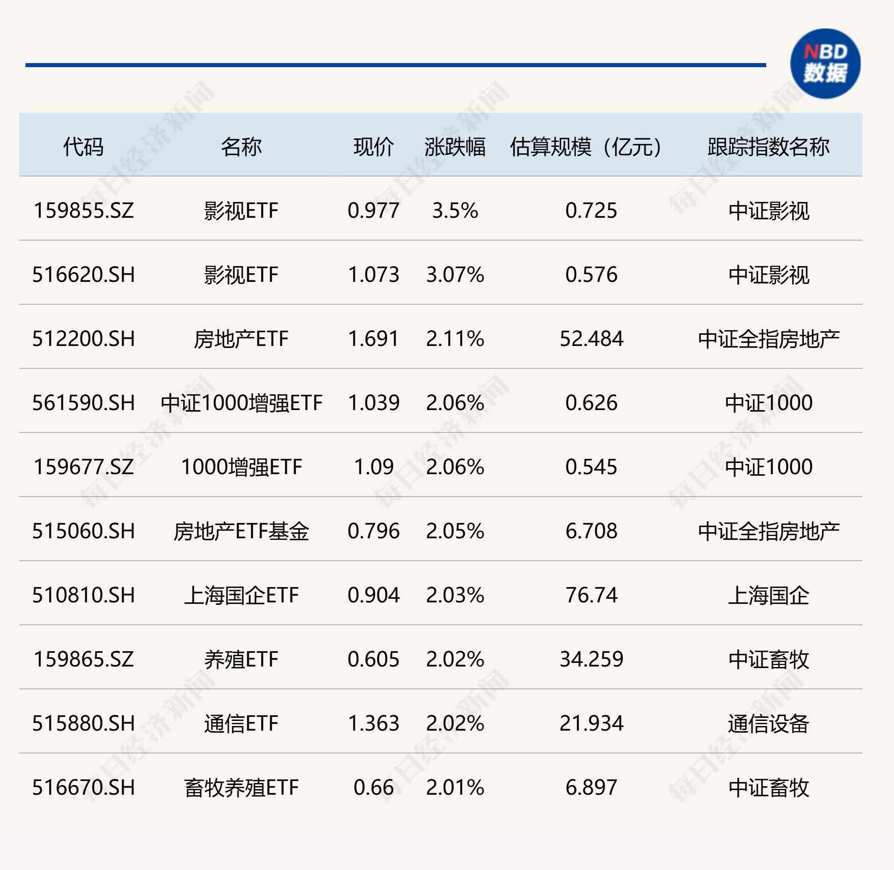 在ETF涨跌幅方面,影视ETF表现出色,涨幅超过3%,成为市场焦点。此外,房地产ETF以及中证1000增强ETF等也均实现了超过2%的涨幅,显示出市场对其未来发展的看好。