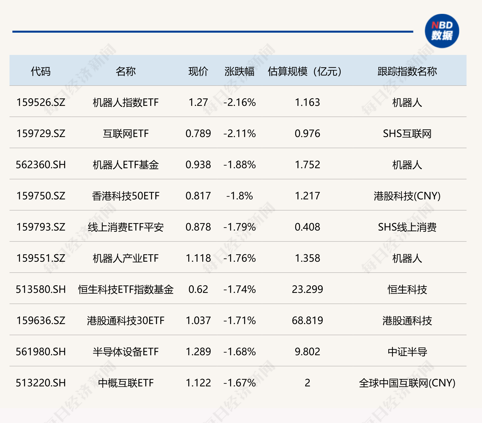 而在下跌方面,机器人指数ETF和互联网ETF跌幅均超过2%,显示出市场对其未来发展的担忧。