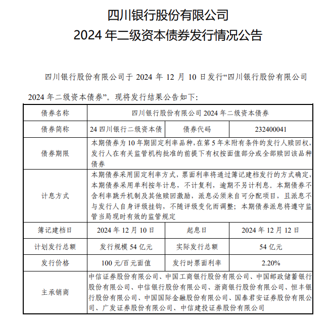 12月10日,四川银行股份有限公司(四川银行)成功簿记发行了2024年二级资本债券,规模达到54亿元,期限为5+5年,票面利率锁定在2.20%。这是四川银行自成立以来首次涉足资本债券市场。