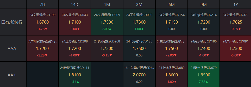 在存单市场方面,今日3个月期国股存单在1.7%-1.8%的位置需求较好,较前一日上行1个基点;1年期国股存单报在1.7%-1.75%的位置,较前一日下行0.25个基点。AAA级存单方面,9个月期成交在1.74%,1年期成交在1.75%的位置。