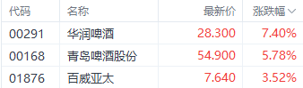 在啤酒股方面,华润啤酒(00291.HK)上涨7.40%,青岛啤酒(00168.HK)上涨5.78%,百威亚太(01876.HK)上涨3.52%,整体呈现出强劲的增长势头。