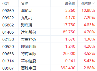 而在餐饮股中,海伦司(09869.HK)上涨10.88%,九毛九(09922.HK)上涨6.94%,海底捞(06862.HK)上涨4.83%,同样展现出市场的积极反应。