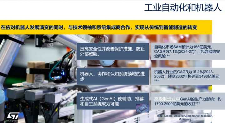 Arnaud JULIENNE进一步指出,传统人形机器人可分为两类:一类是配备强大处理器、广泛应用人工智能资源的先进人形机器人;另一类则是相对简单的人形机器人,目前ST更专注于这一领域。对于这类人形机器人,边缘人工智能在预测性维护方面已发挥重要作用,也可用于后期设备跟踪和自主性故障预警。随着设备本身处理能力不断提升,算法得到极大优化,人工智能已出现在边缘节点上,每个自动化节点都能立即对所处环境做出反馈和决定,加速推动智能制造实现。