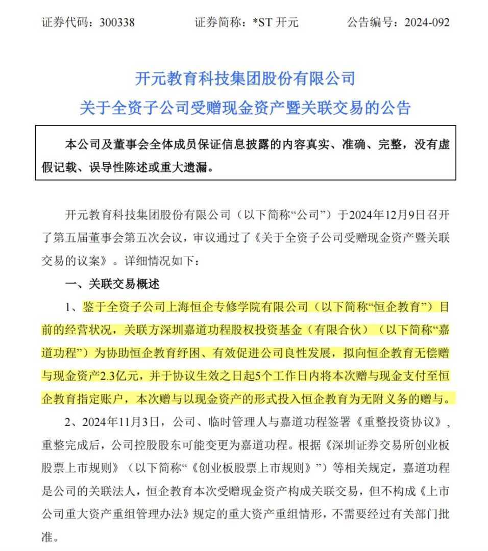 临近年末,多家*ST公司为避免退市各出奇招,而*ST开元则迎来了创投大佬龚虹嘉的慷慨解囊。12月10日晚,*ST开元发布公告,其全资子公司上海恒企专修学院有限公司(恒企教育)将获得关联方深圳嘉道功程股权投资基金(有限合伙)(嘉道功程)无偿赠与的2.3亿元现金资产,以帮助恒企教育纾困,促进公司良性发展。