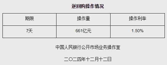 人民银行为维护银行体系流动性合理充裕,于2024年12月12日以固定利率、数量招标方式开展了661亿元逆回购操作,旨在调节市场资金供求,确保金融市场稳定运行。