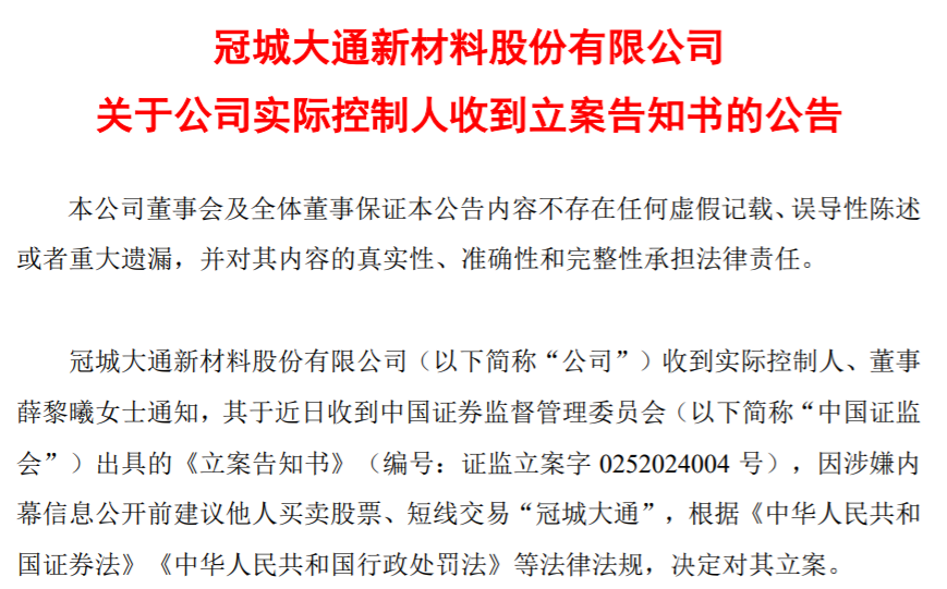 冠城新材公告称,其实际控制人、董事薛黎曦因涉嫌内幕信息公开前建议他人买卖股票及短线交易被证监会立案。公司表示该事项不会对公司日常经营产生重大影响,但股价仍下跌2.40%。
