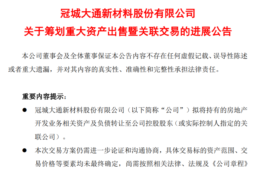 面对房地产行业的深度调整,冠城新材已启动去地产化战略,将业务重心转向电力、电子、电机等相关新材料的研发、生产和销售。12月9日,公司宣布计划将房地产开发业务相关资产及负债转让给控股股东或实际控制人指定的关联公司。