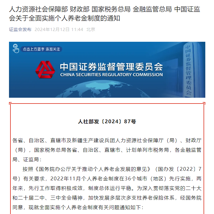 个人养老金制度将于2024年12月15日起正式在全国范围内推广,并将指数基金纳入个人养老金投资范围。此举将直接惠及更多居民,为资本市场引入更多长线稳定资金。