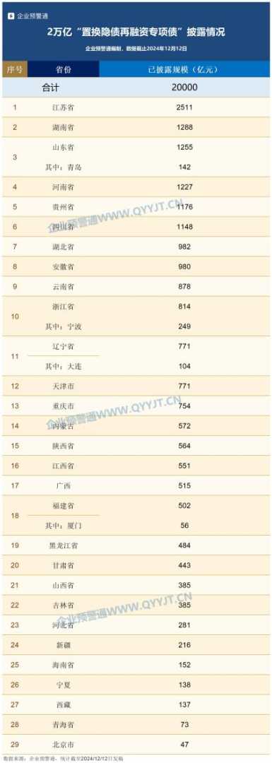 在具体分配上,江苏省以2511亿元的额度高居榜首,占今年2万亿元总额的比重达到约13%,充分体现了江苏省在债务管理方面的积极态度和实力。此外,湖南省、山东省(含青岛市)、河南省、贵州省以及四川省所获得的化债额度也均超过了1000亿元,这些地区在债务置换工作中同样表现突出。