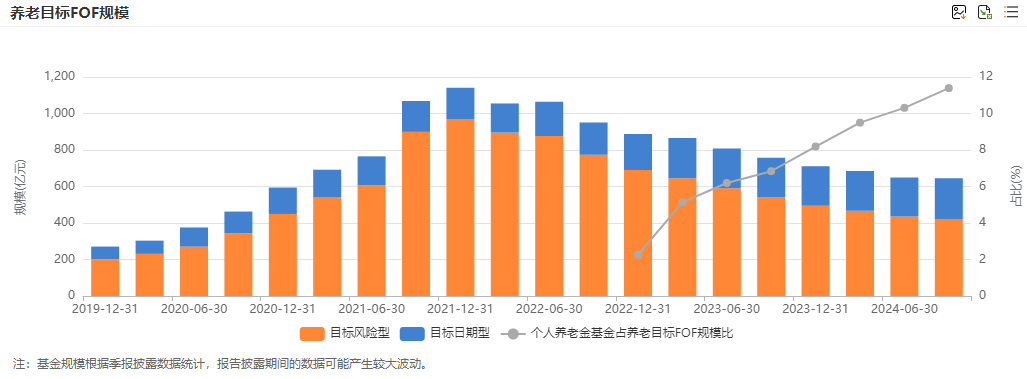 据东方财富Choice终端数据,截至今年三季度末,个人养老金投资规模已达1790亿元,其中养老理财产品占1145亿元,养老目标FOF规模为645亿元。具体来看,个人养老理财产品共24只,规模仅0.42亿元;而在养老目标FOF中,个人养老金基金投资的产品有199只,规模也仅为73亿元。然而,随着个人养老金制度的全面实施,预计其投资规模将迎来显著增长,公募基金、理财产品及商业养老保险产品的市场规模也将随之扩大,同时,相关金融机构间的竞争也将进一步加剧。