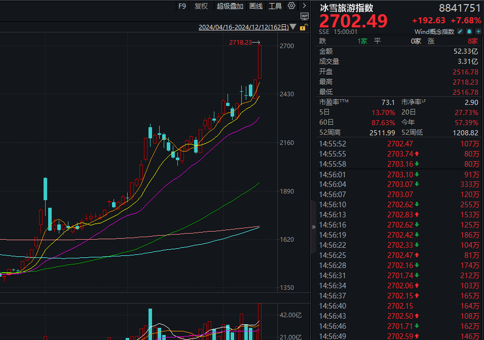 12月12日,市场全天震荡走高,创业板指领涨。盘面上,大消费股成为市场最强主线,其中零售、冰雪产业、食品、家居等多个方向大涨。冰雪旅游指数大涨7.68%,晶雪节能、大连圣亚、英斯派、冰山冷热等多家公司股票集体涨停。自10月以来,该板块指数涨幅已超过50%。