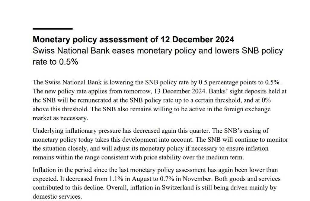 瑞士央行在决议中表示,潜在通胀压力再次下降,今天的货币政策宽松考虑了这一发展。瑞士央行将继续密切监测形势,并在必要时调整货币政策,以确保通胀保持在与中期价格稳定一致的范围内。