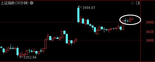 在技术分析方面,上证指数30分钟K线图显示,今日出现了一根涨幅为0.73%的阳线,随后是四根小K线。这种“单阳线+横盘”的组合是蓄势的表现。只要上证指数不跌破今天下午1点半的30分钟K线低点3446点,市场就处于蓄势并带有一定进攻性质的走势结构中。投资者可以关注该点位作为市场短线强弱的参考。