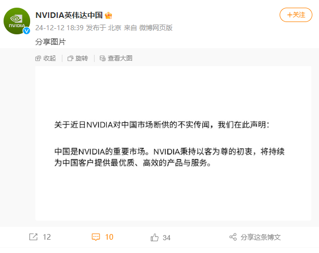 英伟达中国官方声明称,有关公司断供中国的传闻不实,中国是NVIDIA的重要市场,未来将持续提供高质量服务。