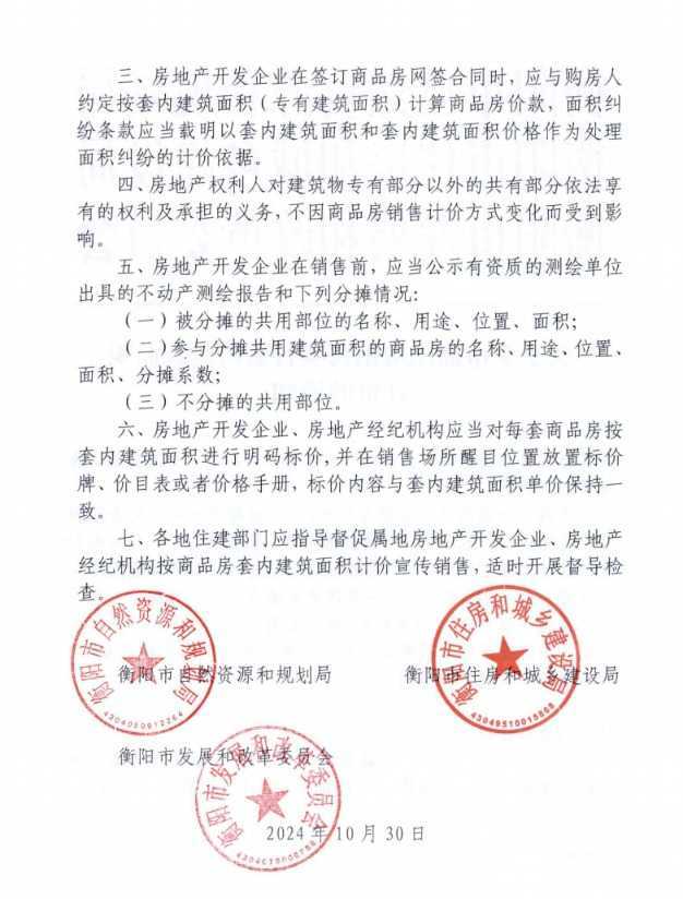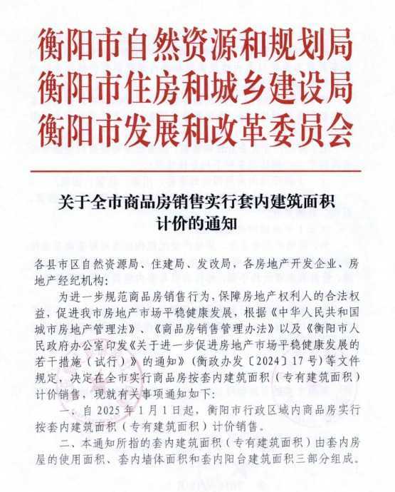 据衡阳晚报报道,衡阳市自然资源和规划局、衡阳市住房和城乡建设局以及衡阳市发展和改革委员会于12月12日联合发布了《关于全市商品房销售实行套内建筑面积计价的通知》。该通知明确规定,自2025年1月1日起,衡阳市商品房销售将实行套内建筑面积(专有建筑面积)计价销售。