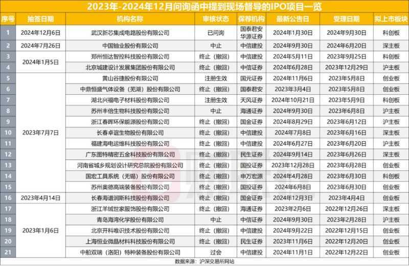 在21个被现场检查的项目中,涉及11家保荐机构,包括国泰君安证券、华源证券、中信建投、中信证券、国元证券、天风证券、海通证券、国金证券、民生证券、国投证券及申万宏源。值得注意的是,目前终止撤回的14个项目分别来自上述多家保荐机构。截至2024年12月12日,A股市场已有431家拟上市企业终止IPO,其中426家因材料主动撤回,主动撤回比例高达98.84%。