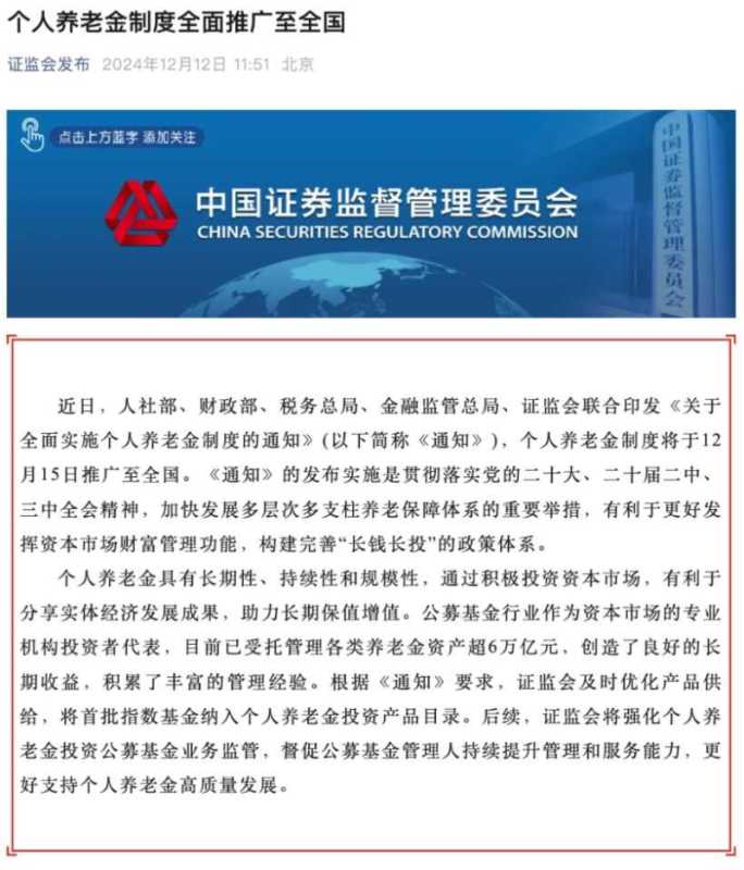 个人养老金制度实施两周年之际迎来重要进展,12月12日,人社部等部门联合发布通知,宣布个人养老金制度将于12月15日全面推广,同时首批85只权益类指数基金被纳入个人养老金投资产品目录。