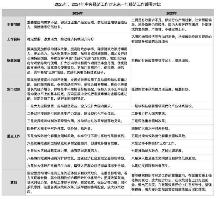 会议提出,2024年将保持经济稳定增长,确保就业、物价稳定,国际收支平衡,并促进居民收入增长与经济增长同步。这一表述较2023年更为明确,稳增长、稳就业、稳物价成为优先任务。