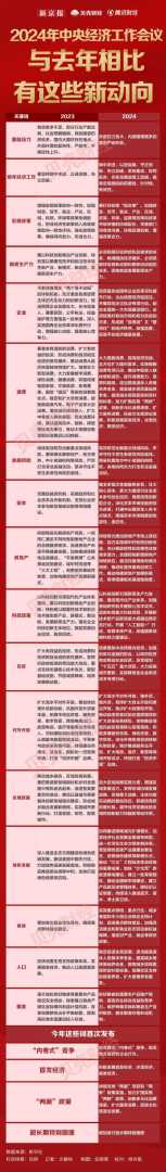 面对挑战,会议要求全社会正视困难,坚定信心,积极将各方面积极因素转化为推动经济社会发展的实际成果。新京报贝壳财经记者对比去年与今年的中央经济工作会议内容后,发现2024年的会议在规划明年各项“关键领域”的发展方面,展现出了诸多新的动向和布局。