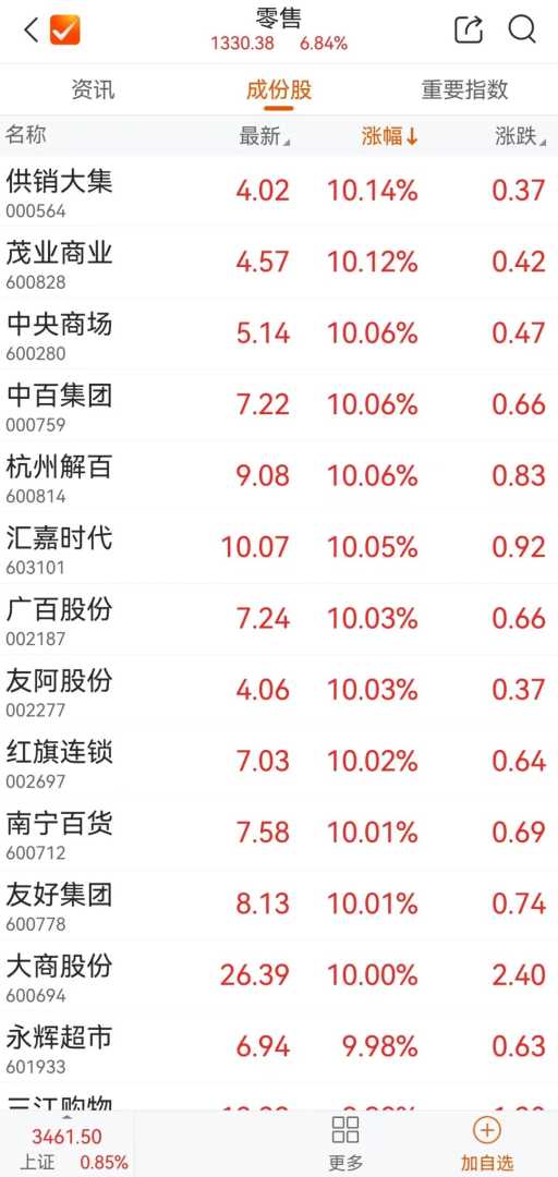 零售股再度走强 多股涨停