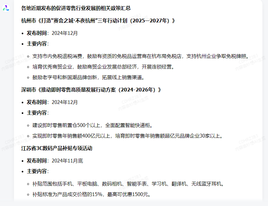 近期,多地出台促进零售行业发展政策,如杭州市发布行动计划,支持免税退税消费,鼓励老字号和新国潮品牌创新;深圳市则提出建设500个以上即时零售前置仓,实现即时零售年销售额400亿元以上。