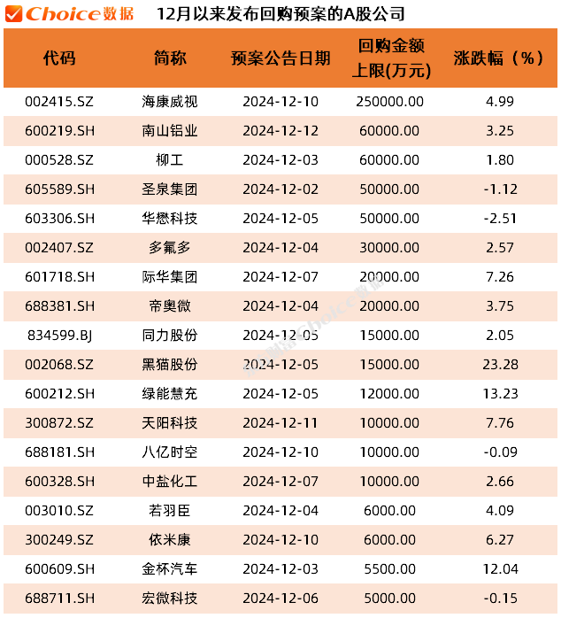 12月以来,上市公司回购预案密集发布。截至12月12日,已有18家公司新发布回购预案,其中海康威视回购金额上限最高,达25亿元,南山铝业和柳工回购金额上限均为6亿元。