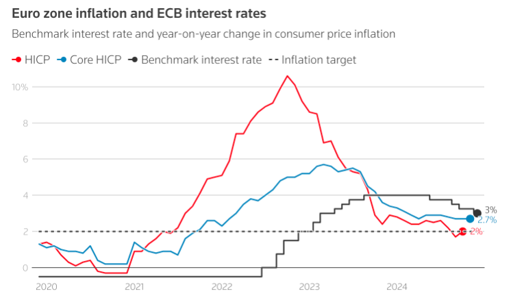 欧洲央行:将存款利率下调25个基点至3%,为今年第四次降息,市场预计到2025年底将进一步降息约130个基点。