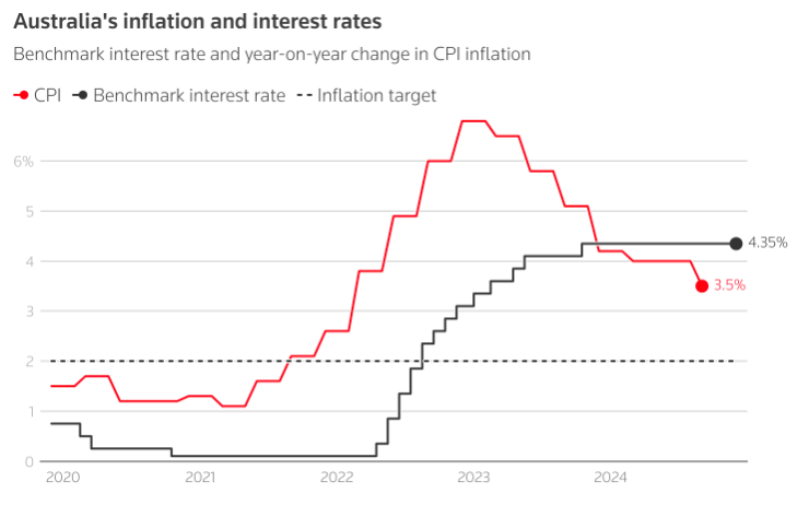 澳洲联储:对通胀论调缓和,市场对明年2月降息25个基点的概率预估升至50%以上。
