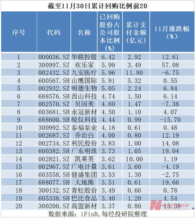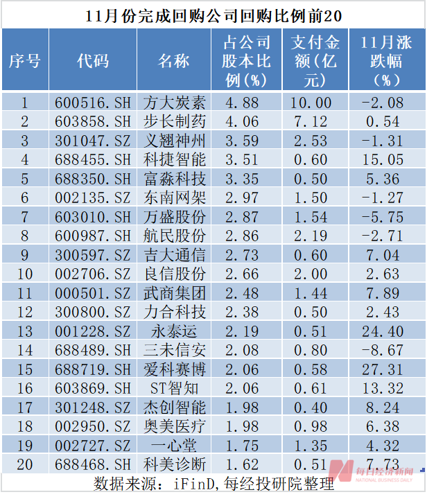 此外,11月份正在回购的公司中,累计回购比例居前的公司股价表现亮眼。其中,方大炭素在不到2个月的时间内回购了10亿元的股份,占总股本比例为4.88%。其股价在回购期间也实现了大幅上涨。
