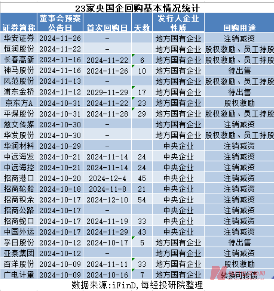 央国企作为国民经济的支柱和A股市场的重要参与力量,在回购方面也发挥了引领作用。10-11月份,共有23家央国企发布回购预案,其中包括14家地方国有企业和9家央企。这些央国企的回购行动进一步提振了市场信心。