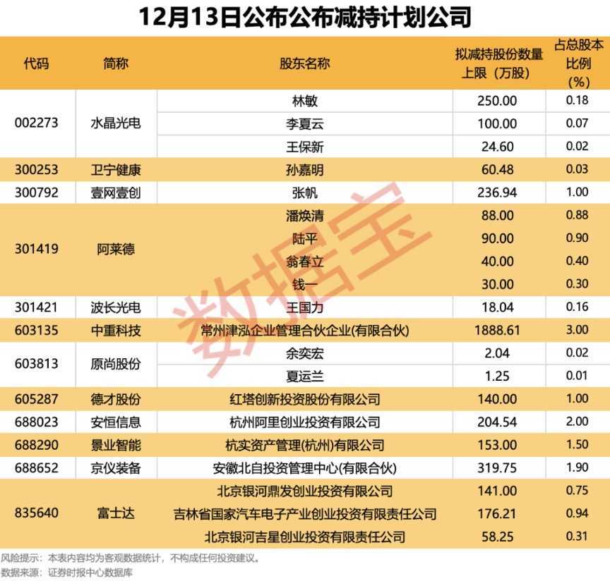 12月13日,资本市场传来消息,共有12家公司对外公布了其股东的减持计划。根据拟减持数量上限占总股本比例统计,中重科技、阿莱德、安恒信息、富士达等个股的股东拟减持比例相对较高,备受市场关注。
