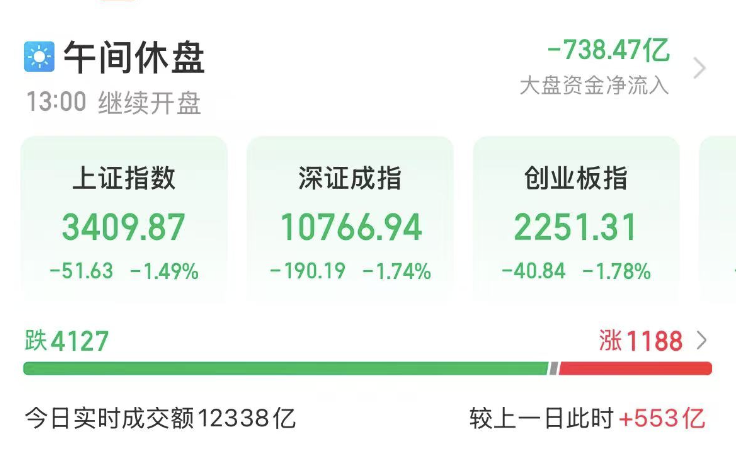 12月13日,A股市场经历集体调整,沪指收跌1.49%,报3409.87点;深证成指和创业板指分别下跌1.74%和1.78%,市场超4000只股票下跌。北证50和中证2000等市场核心指数中,小盘股表现相对抗跌,跌幅较小。