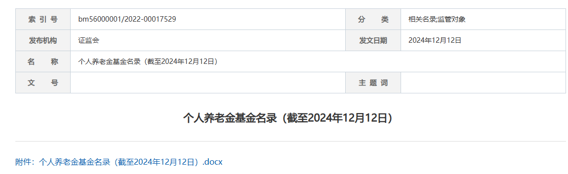 12月12日,人社部等多部门联合发布《关于全面实施个人养老金制度的通知》,同时证监会官网更新了《个人养老金基金名录》。