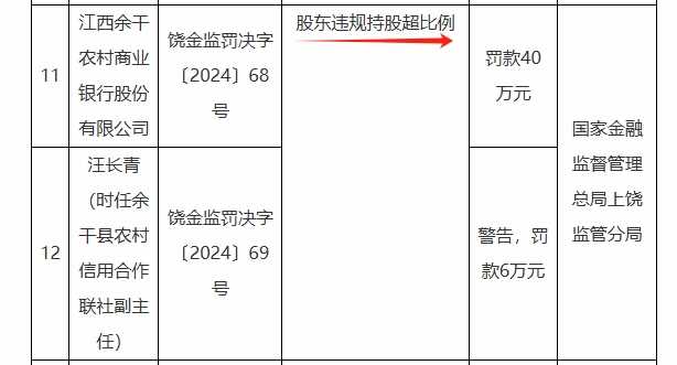 据国家金融监管总局网站昨日(12月12日)披露的最新罚单,江西余干农村商业银行股份有限公司(以下简称“余干农商银行”)因“股东违规持股超比例”被罚款40万元,同时,时任余干县农村信用合作联社副主任汪长青也被处以警告和6万元罚款。