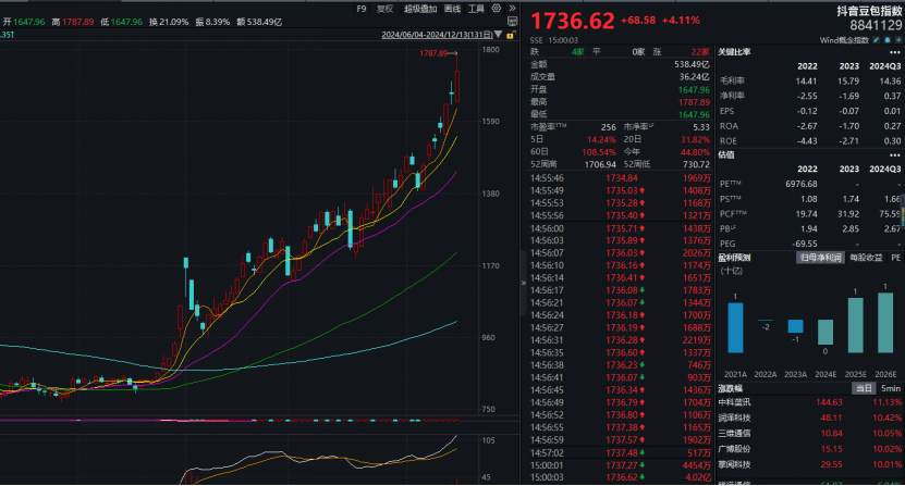 今日,A股三大指数集体调整,保险、地产、白酒、有色、券商等权重板块表现疲软。然而,在此背景下,抖音豆包概念股却逆市大涨,板块指数涨幅超过4%。三维通信、广博股份、掌阅科技、天娱数科等近10股涨停,IP经济、短剧游戏、AIGC等板块也跟随上涨。