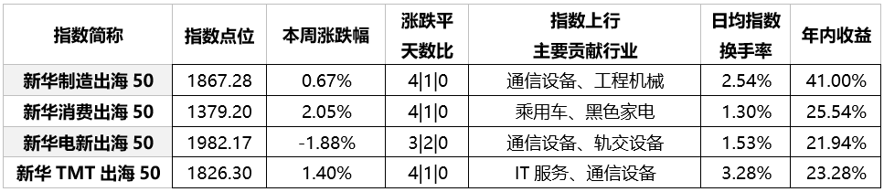 作为抖音豆包概念股之一,新华TMT出海优选50指数成份公司中科创达本周涨幅达18.84%。中科创达表示,公司与火山引擎达成深度合作,共建联合实验室赋能端侧智能,并将参与下周举办的FORCE2024原动力大会。此外,新华出海系列指数本周多数收涨,表现出较强韧性。
