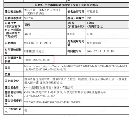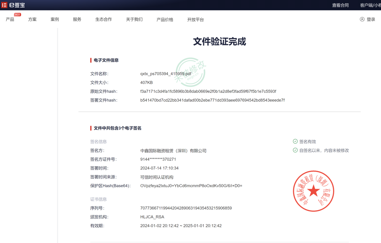 记者验证投资者提供的合同,发现该合同在e签宝和另一家电子签服务提供商“上上签”上均验证有效。这引发了投资者的质疑:如果不是标准流程,e签宝为何可以为其生成合同?e签宝曾向案件主办警官表示,牦牛科技截取了中鑫国际的区块链部分,自行进行了认证和生成公章。