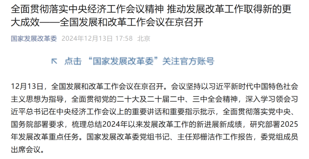 12月13日,全国发展和改革工作会议在京召开,会议总结了2024年发展改革工作成绩,并部署了2025年重点任务,包括强化宏观政策逆周期调节、激发国内需求潜力、深化改革、扩大开放等十大方面。
