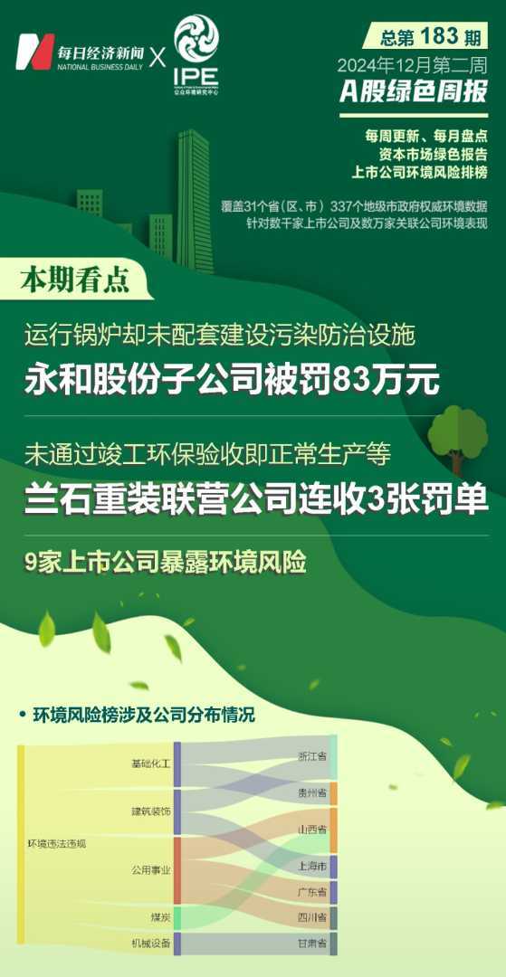 2024年12月第二周,A股绿色周报第183期揭示了多家上市公司在环境保护与信息披露方面的违规行为。永和股份(SH605020)全资子公司因未建设配套污染防治设施被罚83万元,通宝能源(SH600780)控股公司因超许可证浓度限值排放大气污染物被罚35万元。