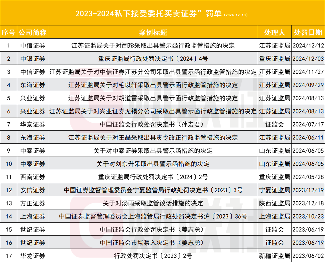 今年以来,“私下接受客户委托买卖证券”违规行为频发,监管层对此类行为的处罚力度不断加强。截至12月13日,相关罚单已达11张,涉及中信证券、中泰证券等多家券商,且出现“双罚”情形。