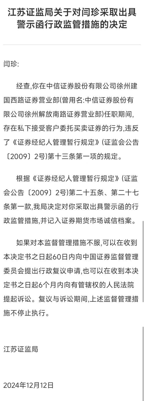 12月13日,江苏证监局公布了对闫珍的处罚决定,因其在中信证券徐州建国西路证券营业部(原名中信证券徐州解放南路证券营业部)任职期间,私下接受客户委托进行证券交易,被采取出具警示函的行政监管措施。值得注意的是,不久前,中信证券江苏分公司也因未能有效防范员工此类违规行为而遭罚。