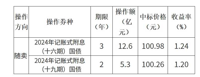 据财政部最新消息,2024年12月17日,财政部成功实施国债做市支持操作,旨在进一步稳定国债市场并提升市场流动性。此次操作具体包括随卖2024年3年期记账式附息国债(十六期),规模为12.6亿元,中标价格高达100.98元,对应的收益率为1.24%。同时,还随卖了2024年2年期记账式附息国债(十九期),规模为5.3亿元,中标价格为100.26元,收益率则为1.20%。