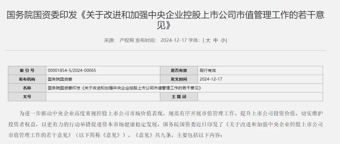 据国务院国资委网站12月17日消息,国务院国资委为深化国资国企改革,提升中央企业控股上市公司的市场价值,正式发布了《关于改进和加强中央企业控股上市公司市值管理工作的若干意见》(以下简称《意见》)。