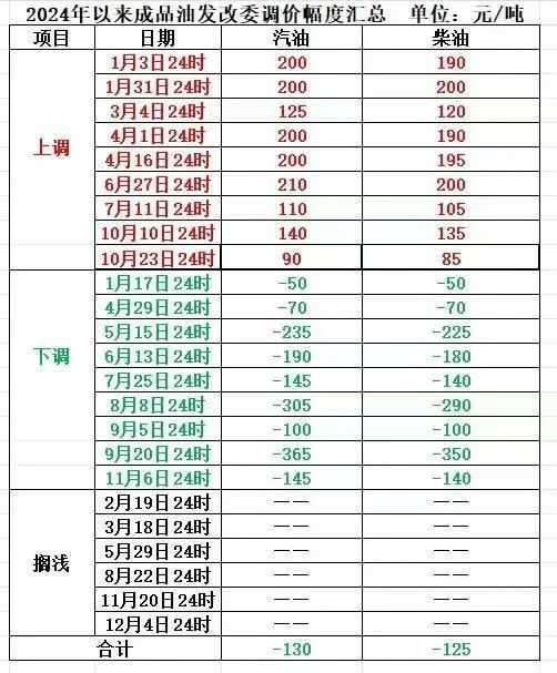 若本轮调价搁浅,成品油零售限价将实现自11月20日以来的三次连续搁浅,居民驾车出行和物流运输燃油成本将保持不变。截至目前,2024年国内成品油零售限价已经历24轮调整,涨跌互抵后,汽、柴油价格每吨较去年底分别下跌130元、125元。